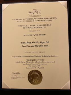 2025年9月8-10日,美国机械工程师学会(ASME)旗下的会议Smart Materials, Adaptive Structures, and Intelligent Systems (SMASIS)在美国密苏里州顺利举行。因重点实验室张颖在自供能智能健康监测领域的重要贡献,荣获了ASME2025年度“结构健康监测(Structural HealthMonitoring)”唯一最佳论文奖(Best Paper Award)。