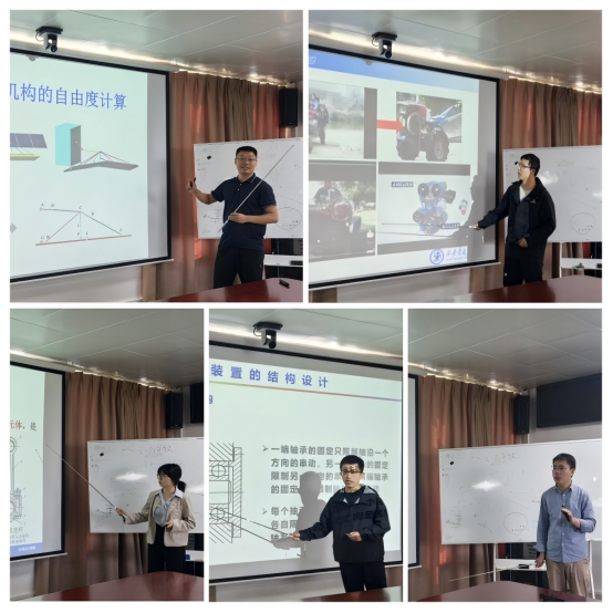 在教学试讲及演练环节,实验室青年骨干余德文助理教授、陈飞助理教授、张盼助理教授、任智军助理教授、马帅军助理教授分别围绕平面机构自由度、带传动、轴承组合支撑、运动副、齿轮传动等展开教学演示。与会专家从教学仪态、授课重点、课堂互动、板书及教学教具使用等方面开展了全方位的讨论与指导。
