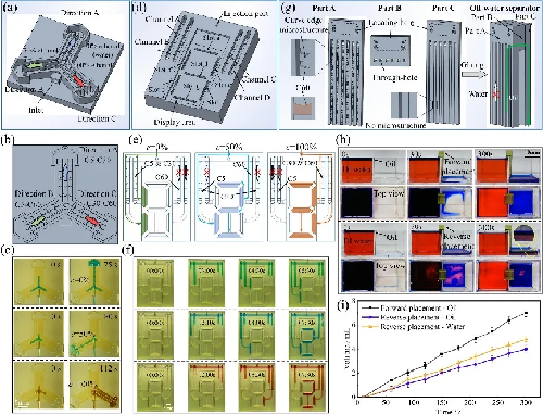 针对上述问题,西安交通大学机械工程学院张辉副教授团队提出了基于最小作用原理(最小能量法)的高曲率弓形边缘设计方法,获得了不同条件下的最优阻碍弓形曲线,从能量角度揭示了弓形边缘对于液体在沟槽内的最大阻碍作用机理,并提出了不同接触角下弓形曲线设计方法与准则。该研究揭示了2016年以来学界未能解释的弓形结构对流体作用机理问题。基于上述理论,研究团队设计并构建了多种功能性微流控器件,包括Y型分支通道、流体数字显示器和油水分离器。其中,Y型分支通道能够利用接触角差异实现液体在支路间的选择性分流;流体数字显示器通过不同液体在不同通道中的路径走向,形成不同的数字图案显示;油水分离器依靠弓形边缘的润湿差异实现无外场高效油水分离,其5分钟分离效率可达约98%。该研究为微流控系统中液体的定向输运、多向调控及智能筛分提供了新的结构策略与设计思路。