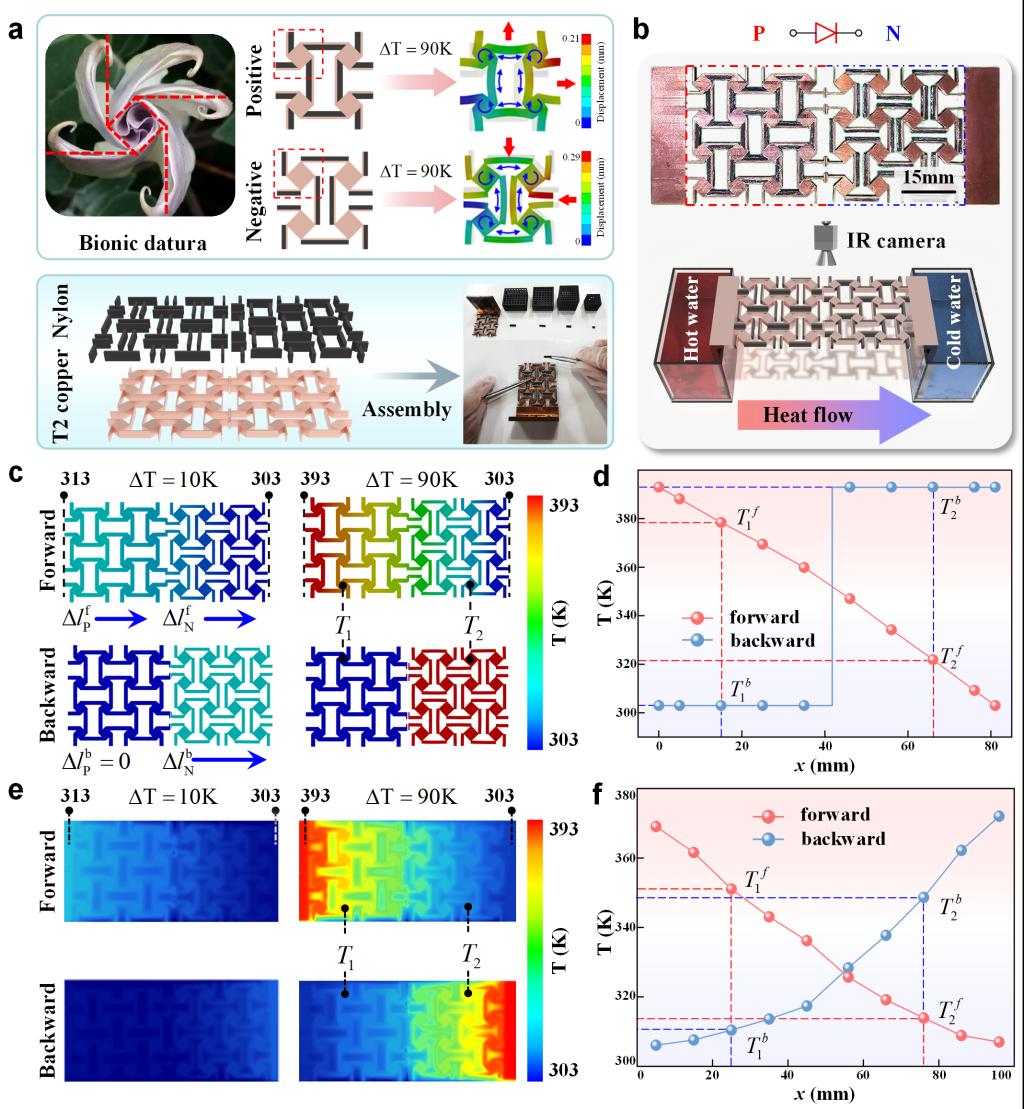 针对这一关键问题,西安交通大学机械工程学院洪军教授、李宝童教授团队首创了基于异质材料协同热膨胀的“热p-n结”物理模型,通过构建定向质量场成功实现了宏观热二极管。该研究建立了热学系统中“定向质量场”与电学中“内置电场”的理论对应关系,揭示了正/负热膨胀材料协同作用下产生的净质量流对系统热导率分布的调控机制,从而打破热传递的空间反演对称性。基于此理论突破,团队受曼陀罗花螺旋生长启发,设计了具有四重旋转对称性的仿生手性超材料单元,将等效热膨胀系数提升至基体材料的7.7倍,并通过引入“可变域边界”,在303-393 K的宽温区内实现了理想热整流效应(整流比η=1)。基于该原理设计的热二极管展现出卓越的性能:在正向传热时,热流密度高达19232 W/m²,系统呈现高效导通状态;而在反向传热时,热流被抑制至接近零值,表现出近乎完美的阻断特性。该研究不仅解决了宏观尺度非互易热传递的实现难题,更为热逻辑器件、智能热防护装甲和热隐身技术等前沿应用提供了新的设计范式与解决方案。